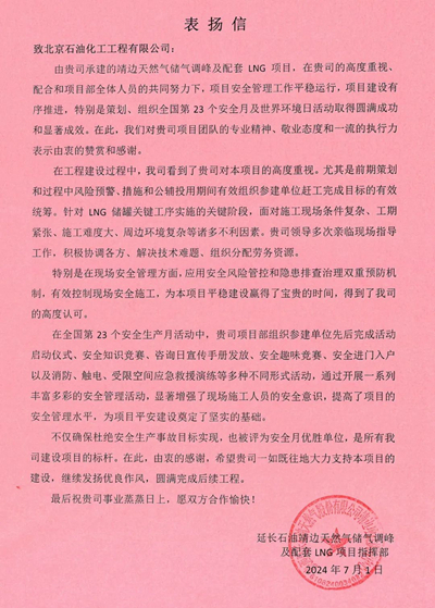 近日,由北京石油化工工程有限公司(簡(jiǎn)稱(chēng):北油工程)總承包的延長(zhǎng)石油靖邊天然氣儲(chǔ)氣調(diào)峰及配套LNG項(xiàng)目安全生產(chǎn)工作得到延長(zhǎng)石油煉化公司肯定,項(xiàng)目部獲得2024年度“安全生產(chǎn)月”活動(dòng)“先進(jìn)單位”稱(chēng)號(hào),3名員工獲得“安全之星”稱(chēng)號(hào)。并收到表?yè)P(yáng)信,對(duì)北油工程在項(xiàng)目建設(shè)期間,規(guī)范的安全管理,有序的項(xiàng)目建設(shè),專(zhuān)業(yè)的團(tuán)隊(duì)表示感謝。